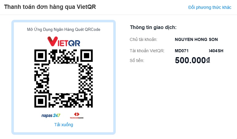 - Tại mục Thanh toán, bạn vui lòng chọn hình thức thanh toán Chuyển khoản ngân hàng qua VietQR.